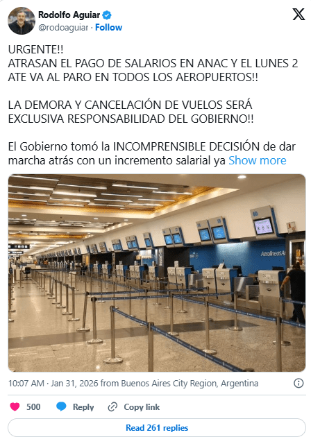 Al respecto, el secretario general de ATE, Rodolfo Aguiar, manifestó a través de sus canales oficiales que el Gobierno decidió “dar marcha atrás con un incremento salarial ya acordado, reliquidar los haberes y dejar a los trabajadores sin salarios”. En el mismo sentido, el dirigente gremial fue contundente al señalar que “la demora y cancelación de vuelos será exclusiva responsabilidad del Gobierno”.