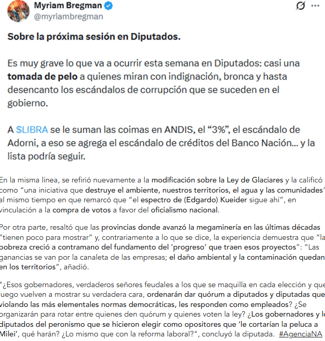 “A $LIBRA se le suman las coimas en ANDIS, el ‘3%’, el escándalo de Adorni, a eso se agrega los créditos del Banco Nación… y la lista podría seguir. Pero el Presidente y sus funcionarios no vendrán al Congreso a dar explicaciones sobre estos hechos. Por el contrario, se atreven a enviar un proyecto para destruir la Ley de Glaciares que, desde sus orígenes, con el ‘Proyecto Maffei’ defendido por Miguel Bonasso y otros en el Congreso, arrastra la sombra de Barrick Gold y del dinero sucio con el que se intentan doblegar voluntades. Es una provocación que se pretenda avanzar como si nada, como si se pudiese fingir normalidad cuando ha estallado un nuevo escándalo de corrupción”, aseguró Bregman.