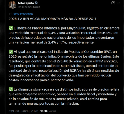 Mediante sus redes sociales, Caputo explicó por qué se registró la inflación más baja desde 2017.