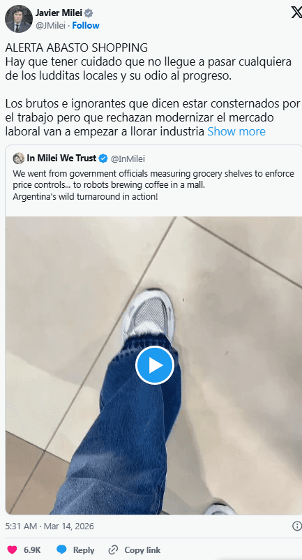 El presidente Javier Milei lanzó una fuerte advertencia a través de sus redes sociales tras la instalación de una nueva máquina automatizada en el Abasto Shopping, señalando que “hay que tener cuidado que no llegue a pasar cualquiera de los luditas locales y su odio al progreso”.