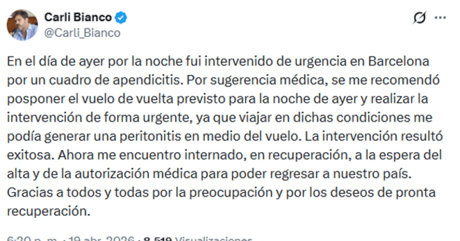 “En el día de ayer por la noche fui intervenido de urgencia en Barcelona por un cuadro de apendicitis. Por sugerencia médica, se me recomendó posponer el vuelo de vuelta previsto para la noche de ayer y realizar la intervención de forma urgente, ya que viajar en dichas condiciones me podía generar una peritonitis en medio del vuelo. La intervención resultó exitosa. Ahora me encuentro internado, en recuperación, a la espera del alta y de la autorización médica para poder regresar a nuestro país. Gracias a todos y todas por la preocupación y por los deseos de pronta recuperación”, manifestó Bianco.__IP__